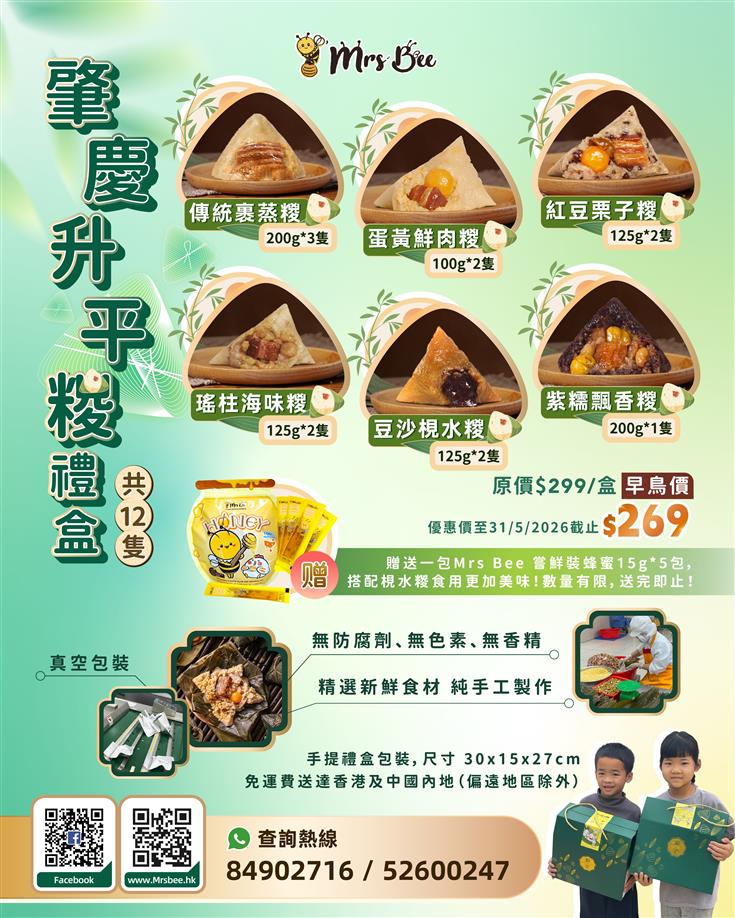禮盒包括:傳統裹蒸糉 200g*3隻瑤柱海味糉 125g*2隻蛋黃鮮肉糉100g*2隻豆沙梘水糉140g*2隻紅豆栗子糉 125g*2隻紫糯飄香糉 200g*1隻附贈一盒 Mrs Bee 嘗鮮裝蜂蜜15g*5包,搭配梘水糉食用更加美味!數量有限,送完即止!真空包裝,無防腐劑、無色素、無香精!精選新鮮食材純手工製作,確保每一個都是真材實料!